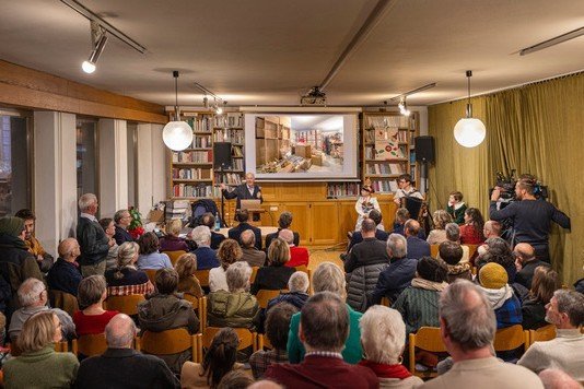 La rapresentanta dla Fundazion Cassa dl Sparani per la Ladinia, Edith Ploner, cun l presidënt dl Museum Georg Senoner y cumëmbri dl Cunsëi, 29.01.2026. La Fundazion Cassa dl Sparani à sustenì la investitzion per la mostra nueva cun n cuntribut finanziel de 20.000 € coche integrazion al sustëni prinzipiel da pert dl Ufize provinziel di Museums.